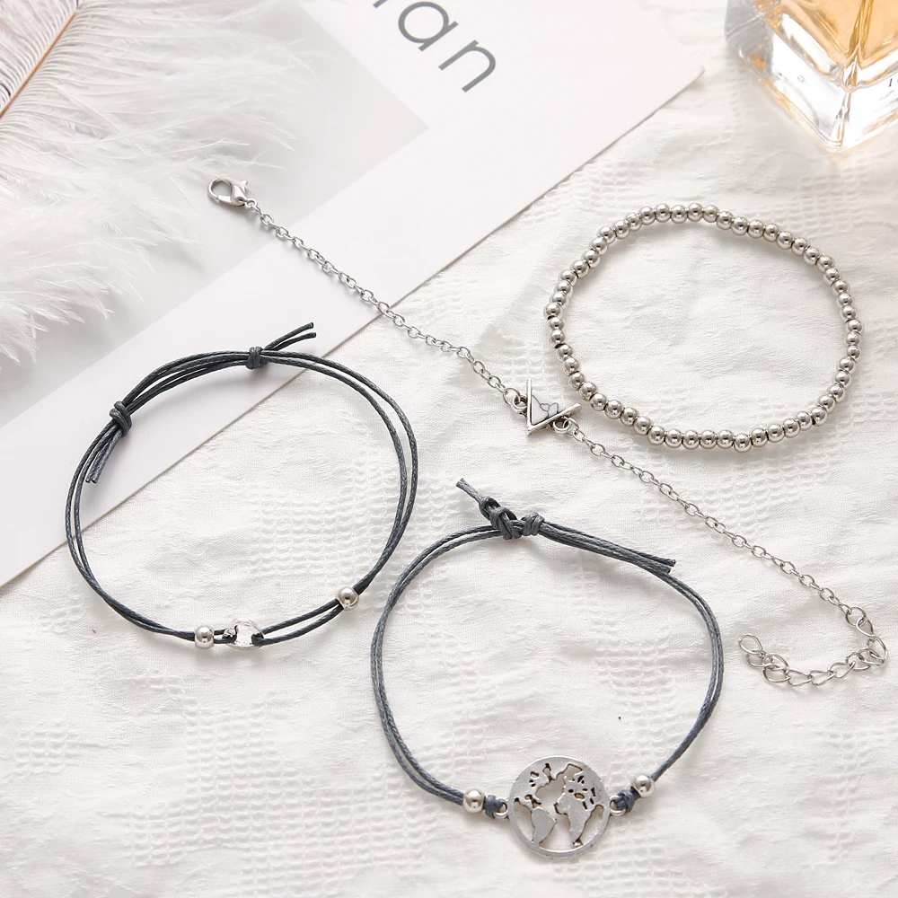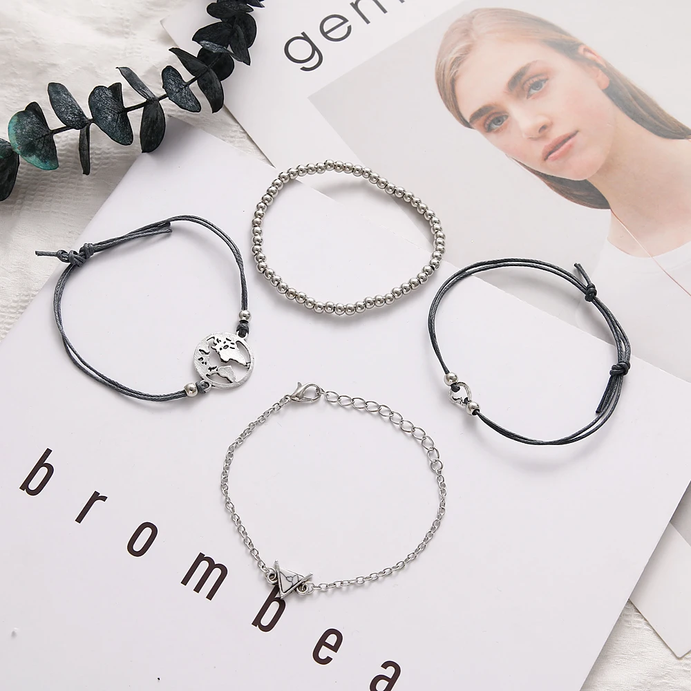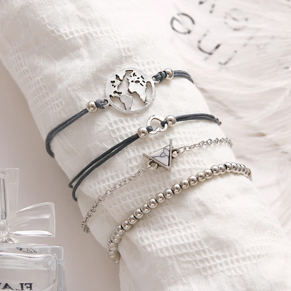 Best 4 Pcs/Set Earth Map LOVE Heart ECG Multilayer Bracelets for Women Crystal Charm Stone Beads Pendant
