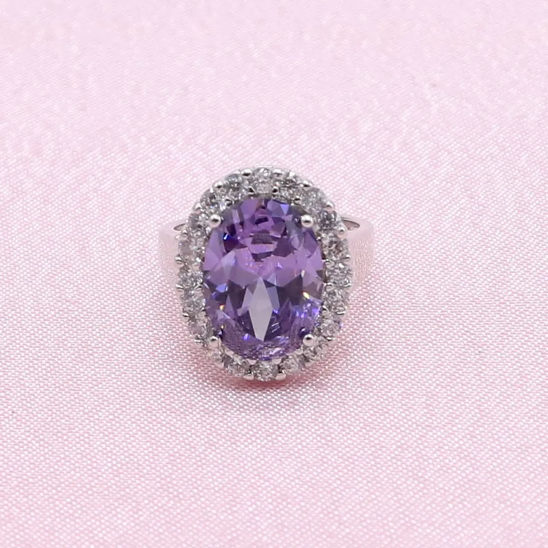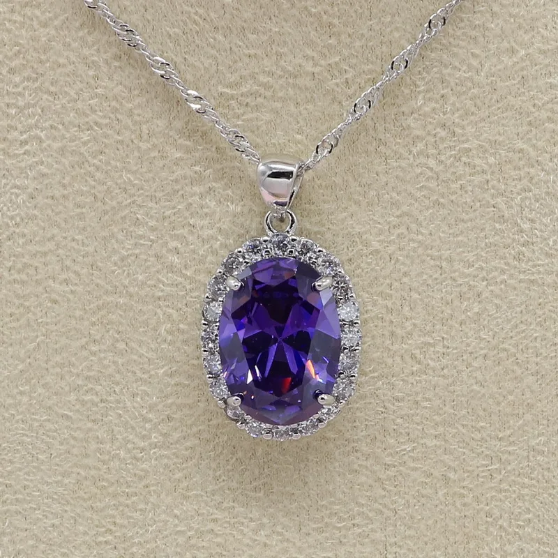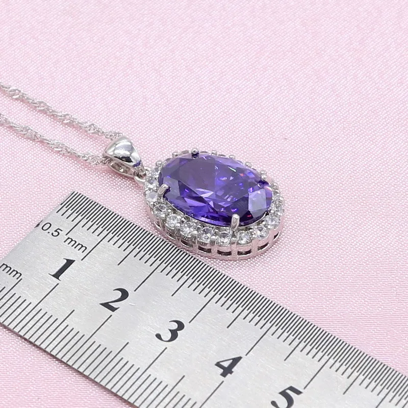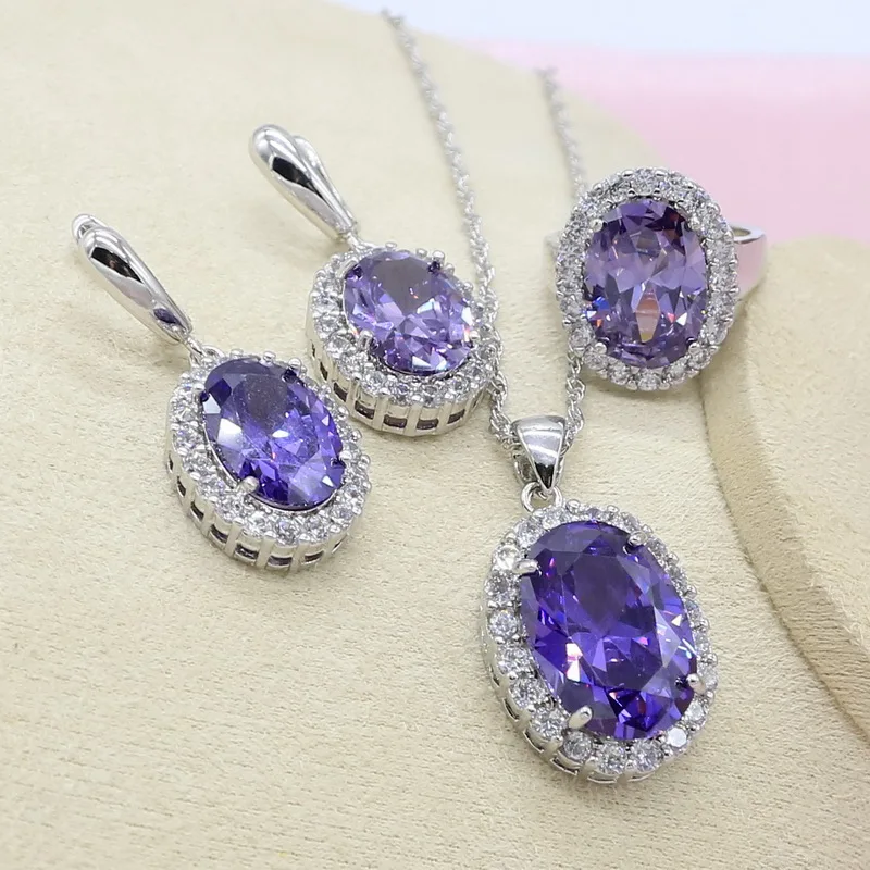 Best 925 Silver Jewelry Sets For Women Wedding Purple Cubic Zirconia Earrings Necklace Ring Bridal Fashi